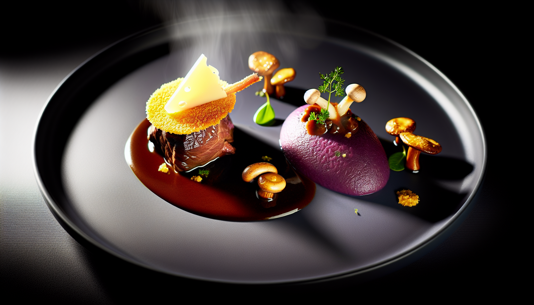 Šveitsi seene-Emmentali krõbeda kattega veisepõsk, lillakartuli püree ja demi-glace (AI koka retseptid)