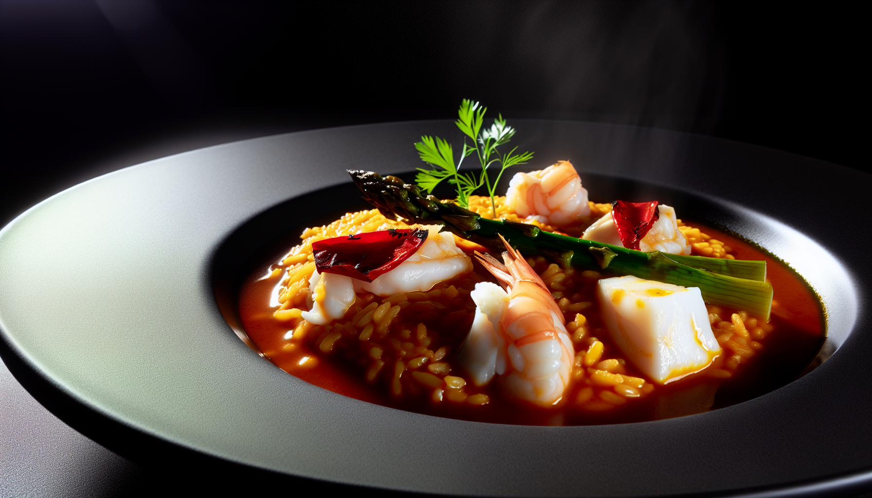 Loo endale Hispaania rannikulõhna köök: arroz caldoso – sametine, kergelt puljongine riis, milles küpsevad magusad Argentiina hiidkrevetid ja õrn tursk. Tomati, šalottsibula ja suitsupaprika sofrito annab sügavuse, valge vein lisab särtsu, sidrun ja till viivad maitse finišijoonele. Kõrvale grillitud roheline spargel toob taldrikule kevadise krõmpsu ja mõnusa suitsuse nüansi. Valmistus on ühe poti rõõm: keeda riis maitseküllases kalapuljongis, lisa mereannid lõpus, monteeri külma võiga ja serveeri kohe, kui riis on kreemjas ning siiski puljongine. See on restoranitasemel roog, mis on samas koduköögis täiesti tehtav – elegantselt lihtne, kuid nüansirikas ning tänu tilli-sidrunisele viimistlusele meeldivalt värske.