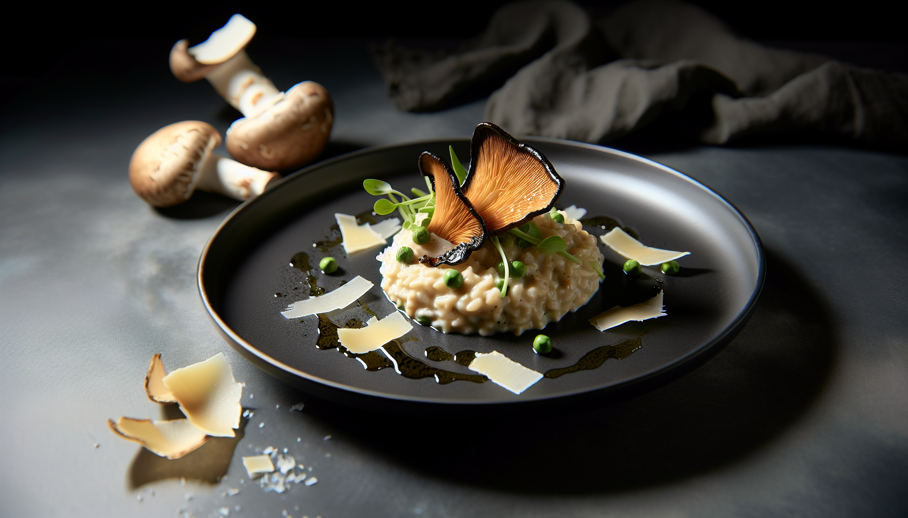 Tekstuuride kontrast – kreemjas riis ja kergelt krõbedad seeneviilud – ning hernevõrsete värske krõmps teevad roost tõelise restoranielamuse. Serveerituna mustal taldrikul, oliiviõli tilkade ja juustulaastudega, on tulemus visuaalselt sama mõjuv kui maitselt.