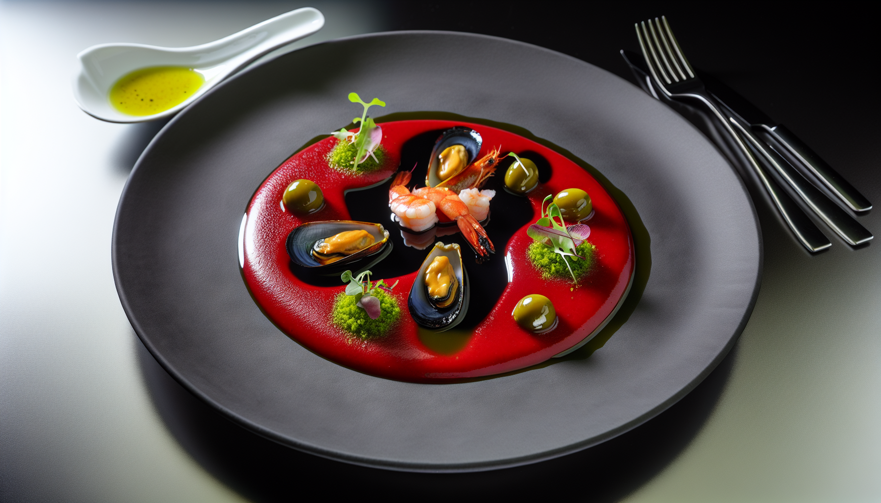 Andsin klassikalisele Hispaania gazpachole mereäärse, nüüdisajalise ilme: sametise tomati-köögiviljapüree kroonib aromaatne frutti di mare – kiirelt tulisel pannil küpsetatud vannamei krevetid ja õrnalt yuzu-ponzu kastmega maitsestatud sinimerekarbid. Gazpacho on emulgeeritud hea oliiviõliga, tasakaalus punase veiniäädika ja kergelt vürtsika cayenne’i noodiga; rohelised oliivid lisavad umamit ja tekstuuri. Serveerin külmalt, mustal taldrikul, kus klaasja pinna peegeldus, oliiviõli tilgad ja värske rukola-peterselli viimistlus loovad elegantse kontrasti. See on roog, mis ühendab Vahemere lihtsuse ja Jaapani tsitrusliku täpsuse – kerge, särav ja restorani vääriline nii jagamiseks kui ka eraldi eelroaks.