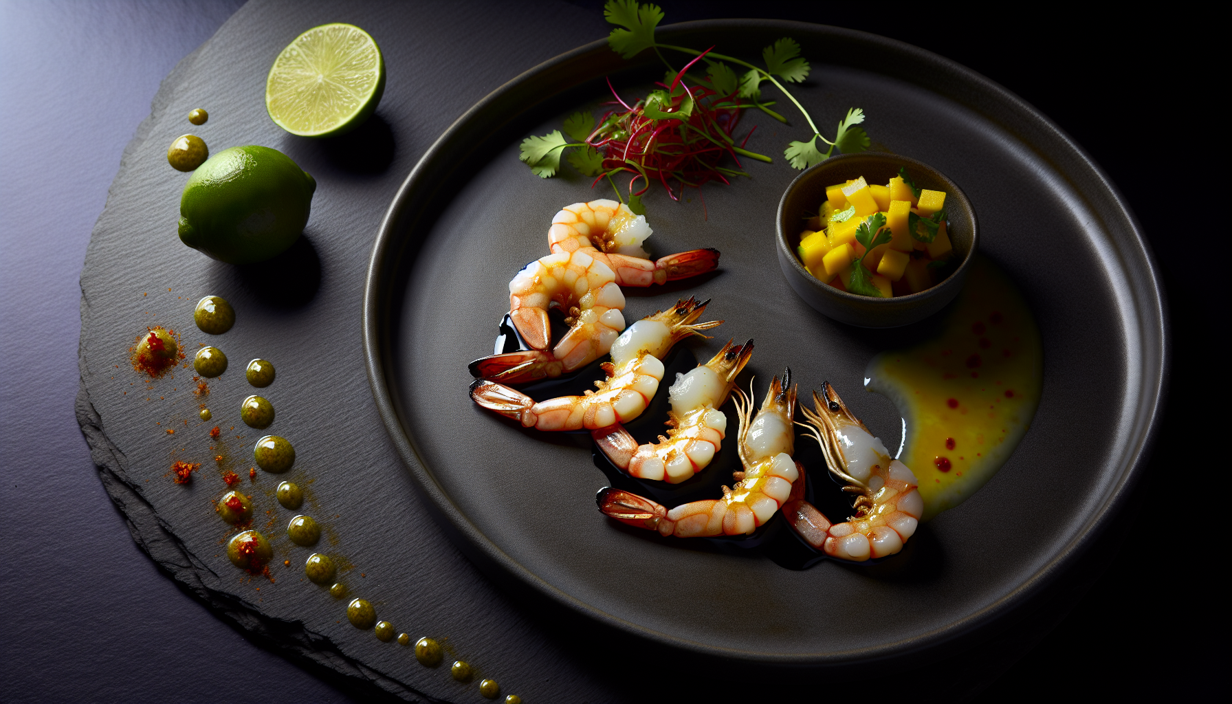 Valmistamises on võtmerollil lühike marinaad, intensiivne kuumus ja napp glasuur, mis keeb nappe-konsistentsini. Karamelliseeritud pinnaga krevetid, kuldsed mangokuubikud ja aromaatsed laimilehed loovad mustal taldrikul elegantse kontrasti. Serveerides pintselda peale veel veidi glasuuri, lisa värske koriander ning laimisektorid. Tulemus on puhas, siidine ja ergas – ideaalne nii õhtusöögi avanguks kui kergeks pearoaks.