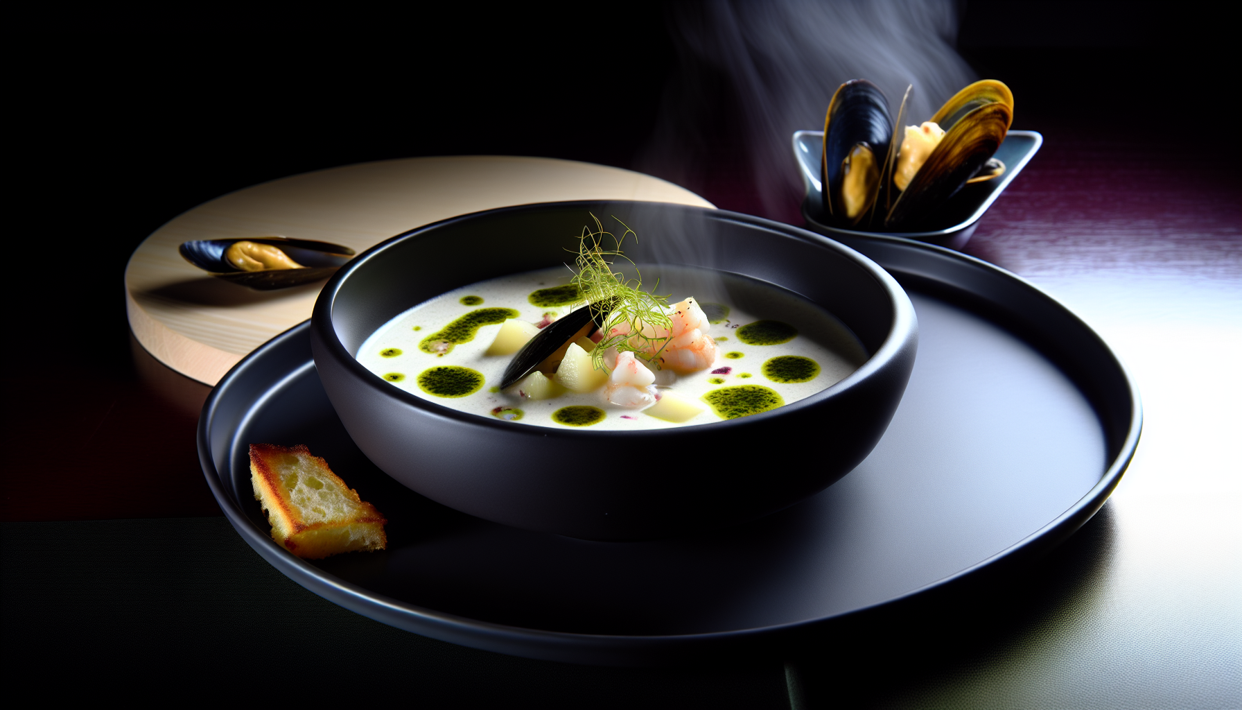Kreemjas chowder on põhjamaise hingega mugavustoit, mis on samas piisavalt elegantne, et särada ka restoranis. Siin põimuvad tursafilee õrnus, magusad krevetid ja mahlased sinimerekarbid suitsuse peekoni, porrulaugu ja koorega, luues sügava, siidise supi. Kalafond annab kihilise meremaitse, varajane kartul hoiab tekstuuri aus ja lõppviimistlusena lisatud tilliõli toob taldrikule värske rohelise aroomikaare.