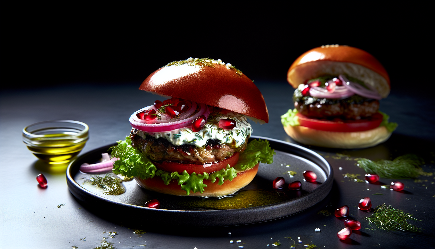 Klassikalise „Greek Lamb Burgeri” modernne versioon, kus lambakarbonaadist valmistatud mahlakad pihvid saavad särama kooreses ürdi-jogurtikastmes. Värske till ja münt, küüslauk ning sidrun toovad kastmesse tzatziki-meeleolu ilma kurgita, et säilitada tekstuuri terav kontrast brioche’i pehmuse ja liha karamellise pruunistusega. Soolakas valge juust (feta-stiilis) sulab kergelt kuuma pihvi peale, samal ajal kui granaatõuna seemned pakuvad rubiinset hapukasmagusat krõmpsu. Frillice salat ja lihav tomat lisavad värskust ning kihistust, brioche’i kergelt magus kukkel seob kõik komponendid elegantselt kokku.