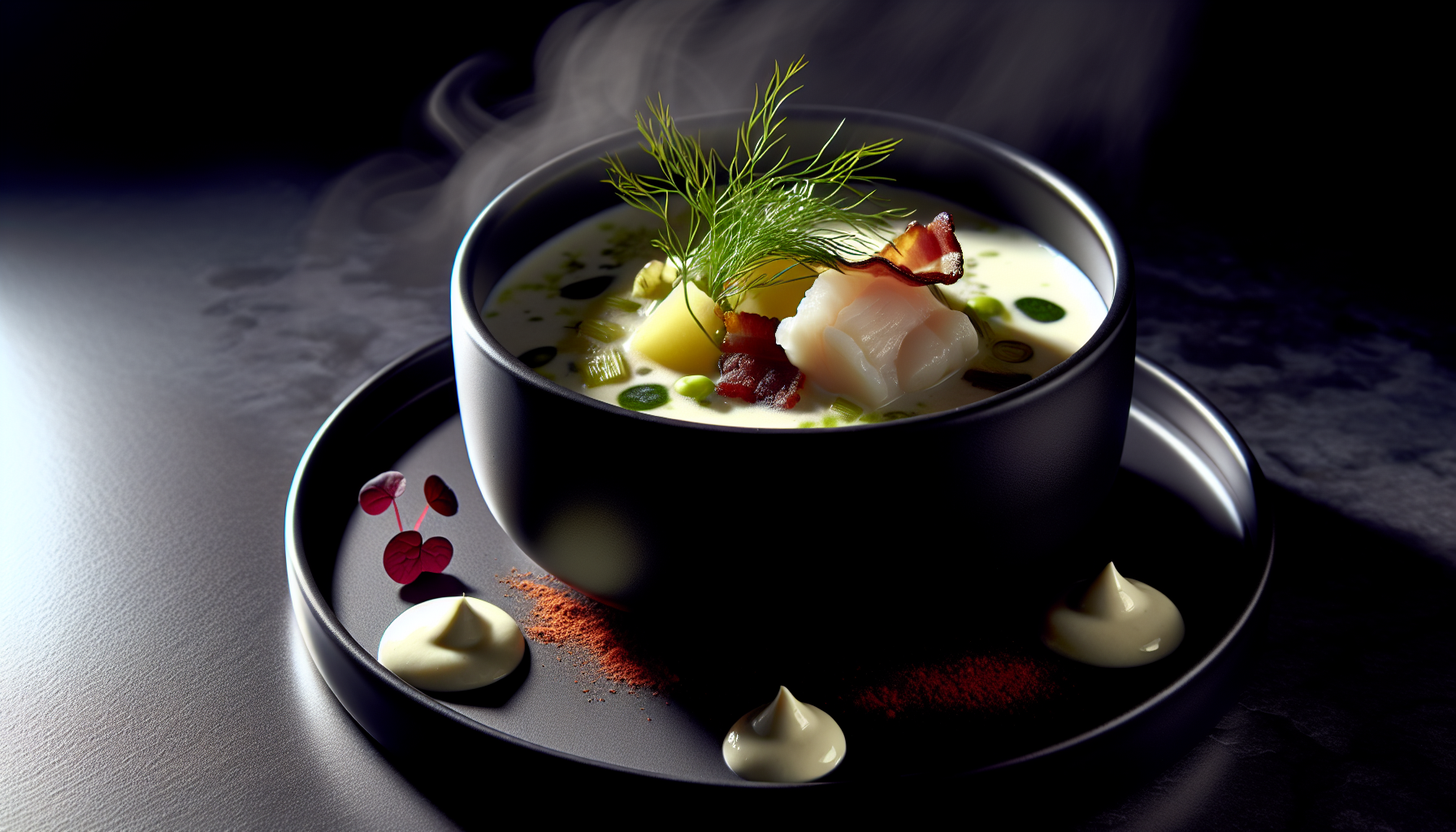 Elegantselt tummine, ent samas õrn Põhjala kalachowder ühendab Põhjamere karged maitsed ja modernse esituse. Suitsutatud peekon annab puljongile suitsuse selgroo, millele lisanduvad porrulaugu magusus, kartuli siidine kehakus ning tursafilee helbeline õrnus. Tasakaalu loob koore ja täispiima harmoonia, samas kui till ja kerge suitsupaprika toovad esile merelise nüansi. Serveerimisel lõpetab roa amarantkress, lisades värvi ja peent rohelist teravust. See chowder on restoranitasemel mugavustoit, mis valmib ühes potis ning on kodus teostatav: professionaalsete võtetega saavutad klaari, samas sügava maitsega supi. Valmista seda külmal õhtul või serveeri väikse portsjonina šikina eelroana mustal taldrikul – efekt on garanteeritud.