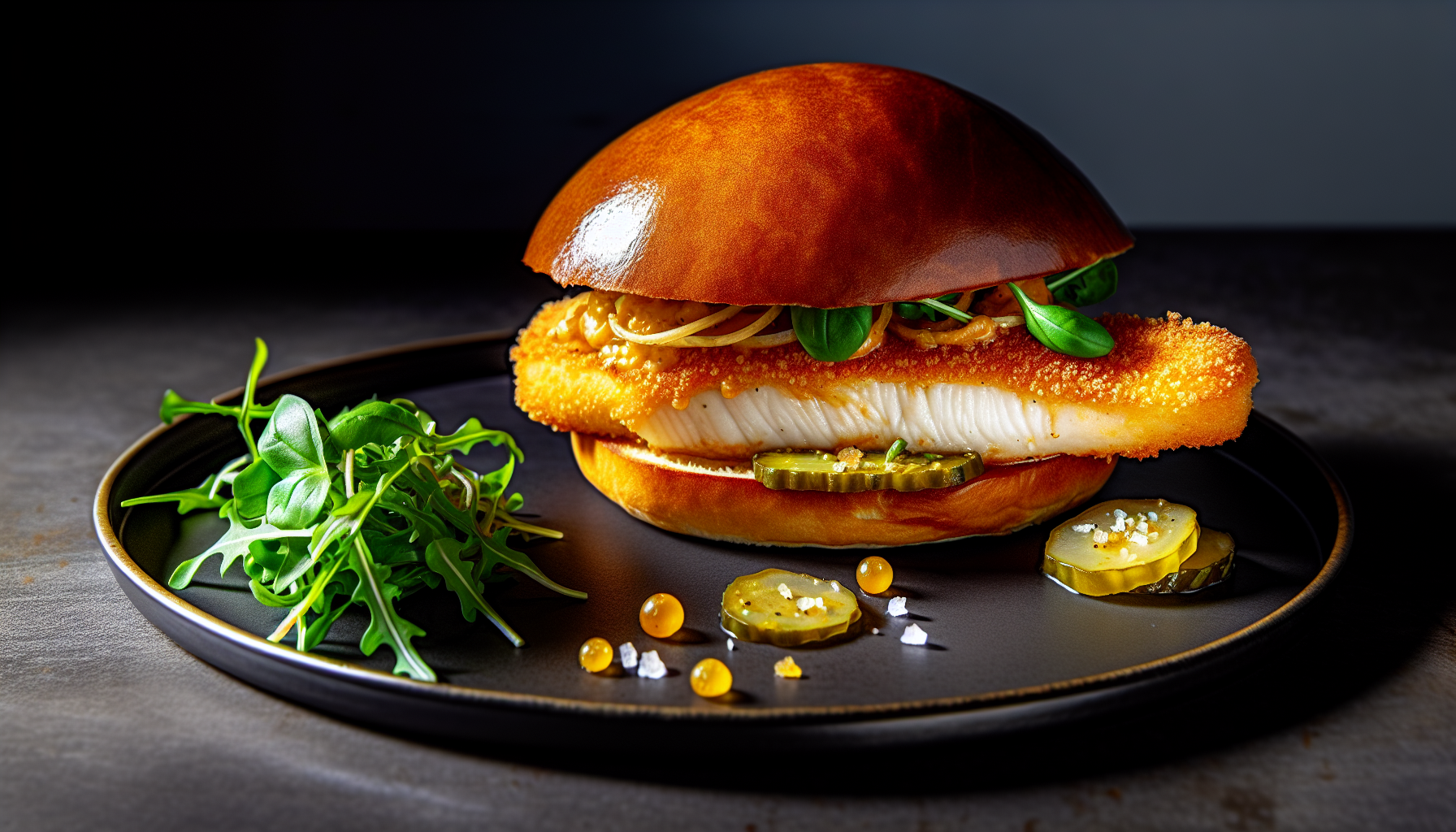 Klassikaline fish sandwich saab uue, rafineeritud kuue: brioche’i vahel kohtuvad krõbe panko-paneeringus tursafilee ja suitsuselt vürtsikas chipotle-tartar. Majoneesi, sidrunimahla, pärlsibula ja küüslauguga kokku segatud kaste toob välja kala magusa mahlasuse, samal ajal kui marineeritud kurgiviilud lisavad iseloomukat krõmpsu. Rukola ja kollased kirsstomatid annavad taldrikule värskust, basiliku lehed viivad aroomi järgmisele tasemele. Kogu roog on mõeldud koduköögis teostatavaks, ent restoraniliku tulemusega: kullakarva brioche’i läige, helisevalt krõbe paneering ja Maldoni soola viimane aktsent loovad täiusliku suutäie. Serveeri kohe, kui kala on õlist tõstetud – just siis, kui paneering on veel maksimaalselt õhuline.