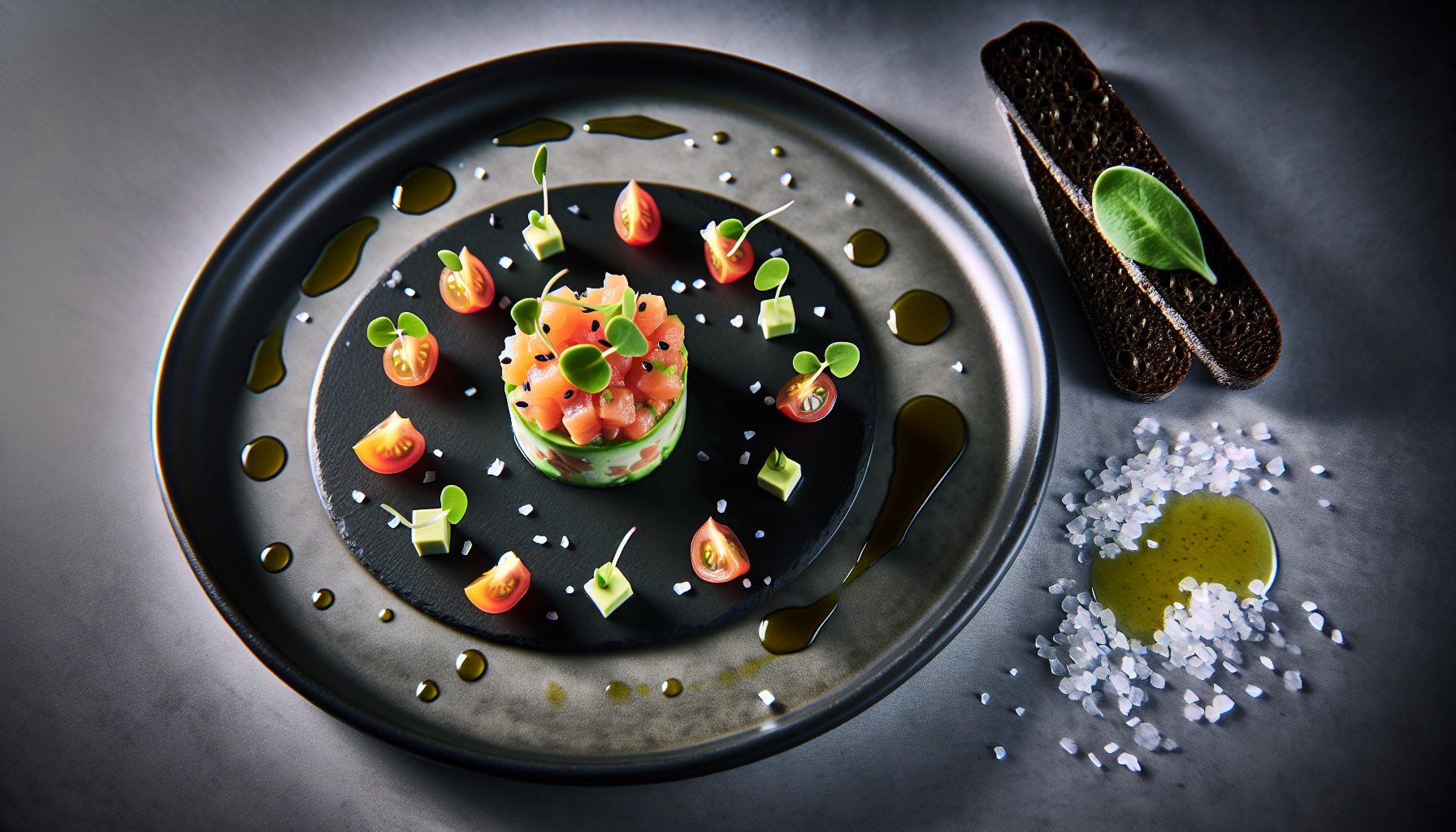 Elegantne eelroog, mis ühendab põhjamaise suitsulõhe puhta maitse ja Aasia nüansid. Siidine avokaado, krõmpsuv kurk ja hapukas sidruni–riisiäädika vinaigrette raamivad lõhe, tuues välja selle umami ja suitsuse sügavuse. Mustad seesamiseemned lisavad kergelt pähklist nooti ning mikrokressid annavad värsket piprasust ja kõrgust taldrikul. Kõrvale küpsetatud tume ciabatta muutub õhukeste crostinidena mõnusalt krõbedaks ning toimib täiusliku tekstuurilise kontrastina. See on roog, mis näeb välja sama peen kui maitseb – ideaalne alustus mitmekäigulisele õhtusöögile või šikile brunch’ile. Plating keskendub puhtale joonisele: vormis seatud tartar, mikrotaimede ja tomatisektide aktsendid, oliiviõli läige ja Maldoni helveste viimane puudutus.