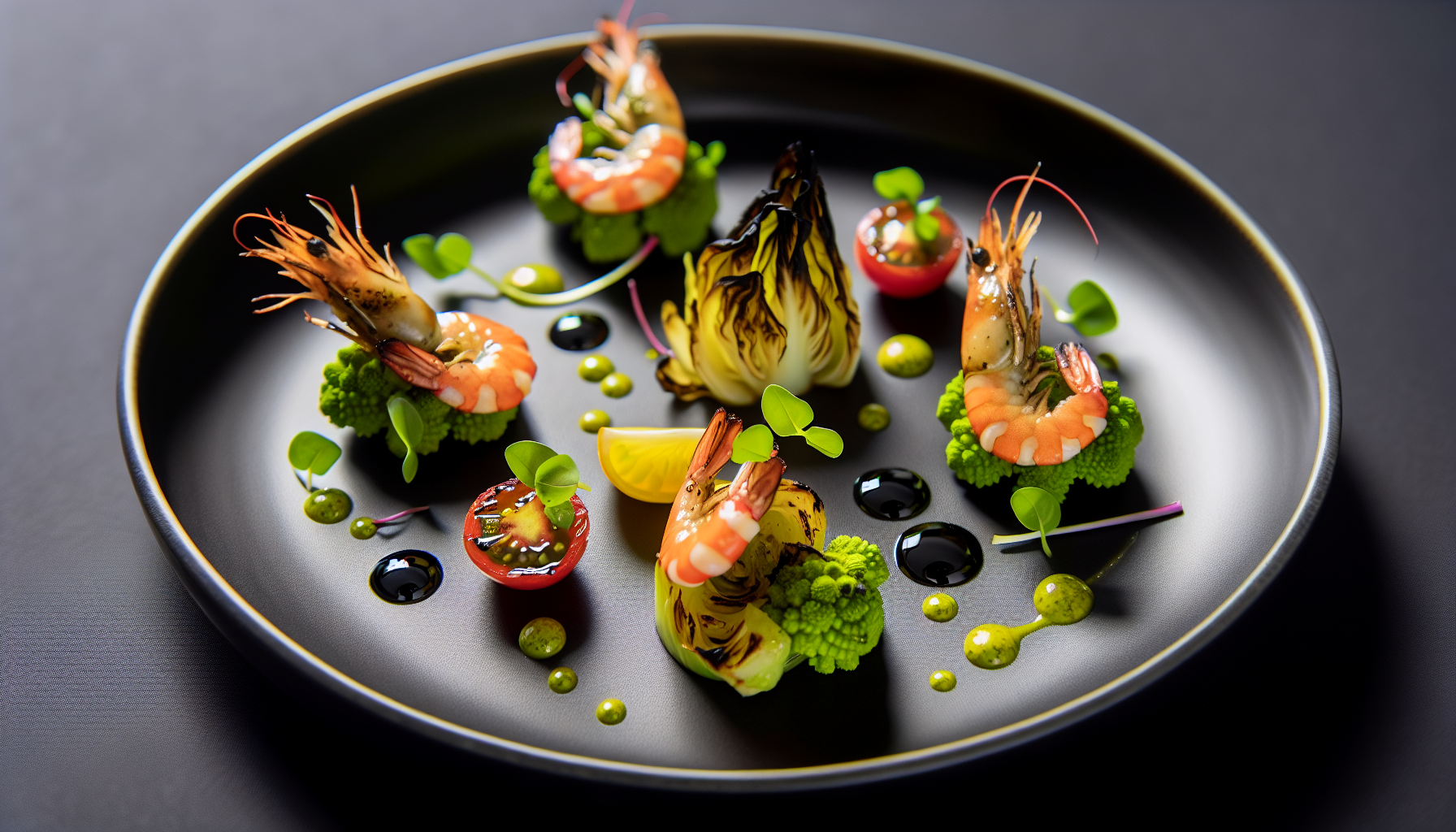 Küpsetatud vannamei krevetid musta küüslaugu‑aioliga, söestatud romanesco ja kapparivinegretiga (AI koka retseptid)