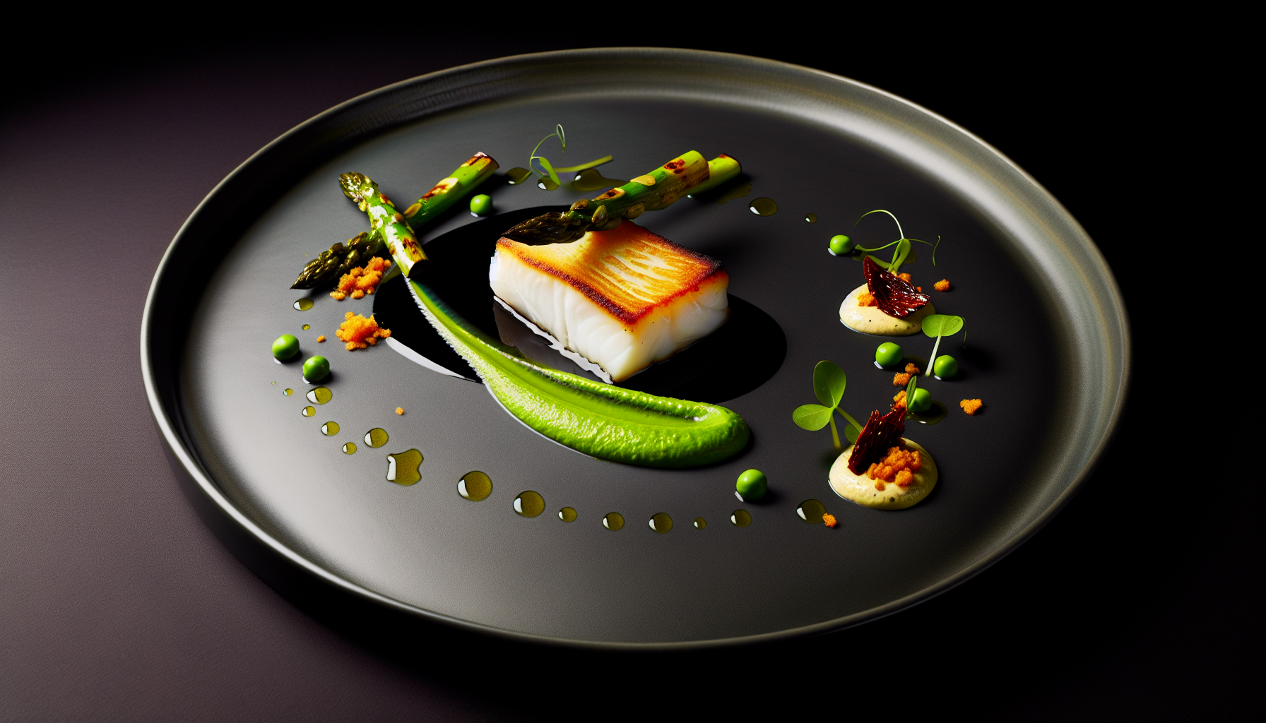 Pannil küpsetatud tursk sidrunheina–kookose nage’iga, herne-basiilikupüree, spargli ja päikesekuivatatud tomati–kõrvitsaseemne krõbedikuga (AI koka retseptid)