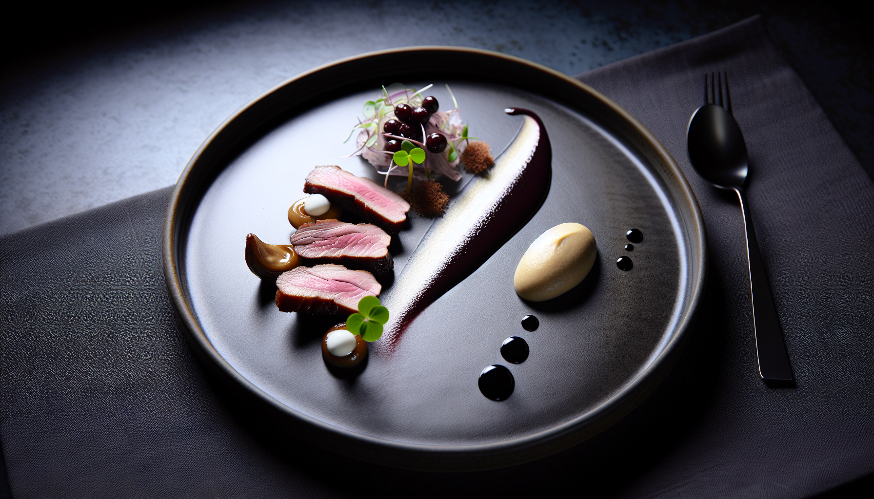 Selles roas kohtuvad skandinaavialik puhtus ja ümara maitse sügavus. Pardifilee rammus nahk pruunistatakse aeglaselt, et rasv kenasti välja sulaks ja pind muutuks karamelliseks, samal ajal kui liha jääb õrnaks ja roosakaks. Silkselt kreemine pastinaagipüree loob maitsekandja, mille pähkline magusus toob esile pardi mineraalsuse. Shimeji seened saavad kiire ja intensiivse pannisuudluse, mis lisab tekstuuri ja kerget metsamaitset. Kõik seotakse kokku särava mustsõstra–balsamico glasuuriga, milles marjane happesus ja siidine läige annavad taldrikule nii rütmi kui läiget. Laim lisab viimistlusena karget tsitrusnooti, mis tasakaalustab siirupi ja kreemi magus-haput telge. Lõpetuseks värske mesclum, kergelt õli ja laimiga puudutatud, toob roale kontrasti ja elu. Serveering on minimalistlik, ent täpne: viilutatud pardifilee puhkab pastinaagisoojaku kõrval, seened markeerivad vertikaali ning glasuur joonistab taldrikule sametise signatuuri. See on taldrikutäis, mis kõlab nagu hästi komponeeritud akord – tasakaalus, elegantne ja meeldejääv.