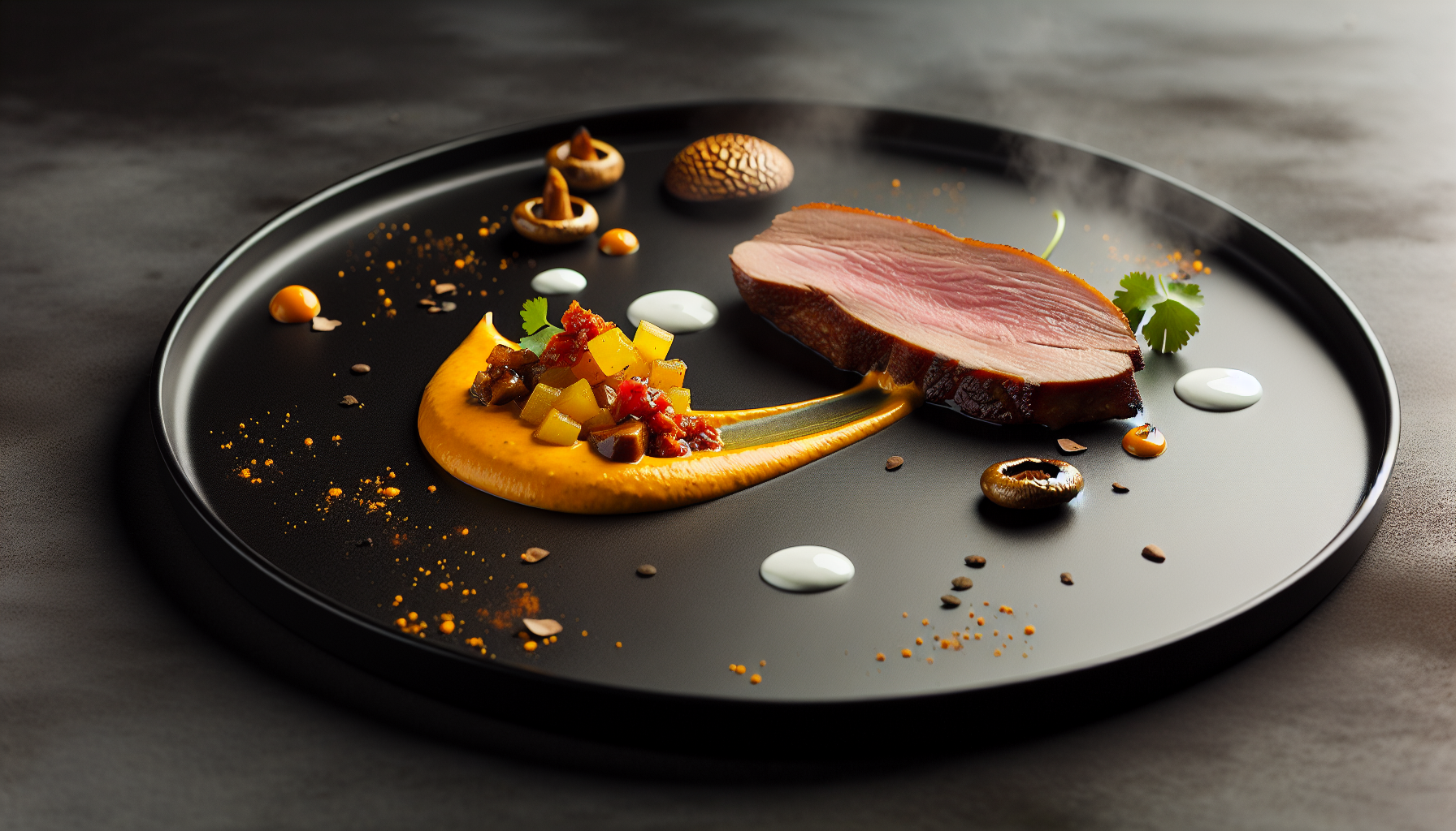 Peen ja tasakaalus roog, kus sügava maiguga pardirind kohtub suitsuse, kreemise ja värskega. Nahapoolt aeglaselt välja sulatatud pardirasv tagab perfektselt krõbeda naha ning roosa, mahlase sisu. Kõrvitsa-jogurtikreem kannab suitsuse paprika nüanssi ja siidist tekstuuri, kergelt magusa varjundiga kõrvits toob tasakaalu linnuliha rikkusele. Kollase tomati ja päikesekuivatatud tomati salsa lisab hapukas-umamist kontrasti, koriander toob särava ürdisuse. Shimeji seened saavad pannil pardirasvast kuldse glasuri, seedermänni seemned annavad õrna pähklikrõmpsu – detail, mis tõstab suutäite struktuuri mänguliseks. Lõpetuseks paar tilka musta trühvliga väärisoliiviõli seob komponendid elegantseks tervikuks.