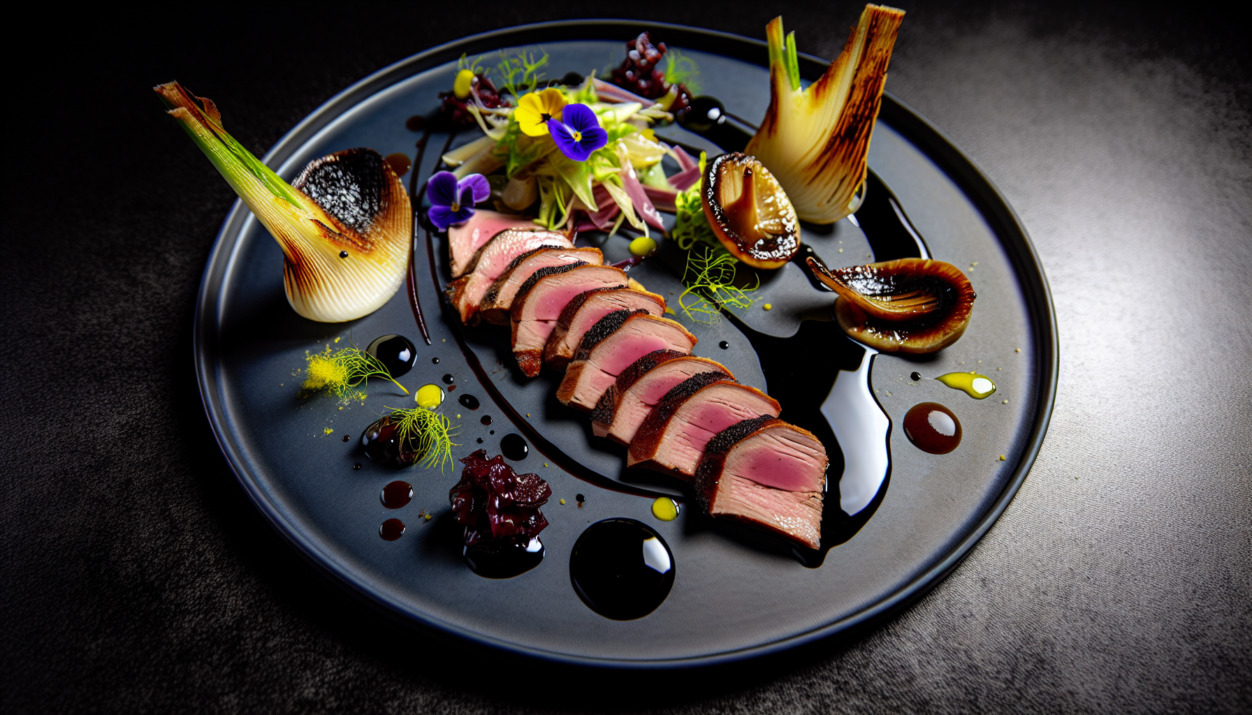 6) Serveeri: Tõmba musta taldriku põhja kastmekaareke. Viiluta pardirind ja laota naha pool üles. Lisa karamelliseeritud fenkol, peen fenkolisalat ja portobello. Nirista kastet, jaota mõned soojad marjad, puista meresoola helbeid ja värsket pipart. Viimistle söödavate õitega.