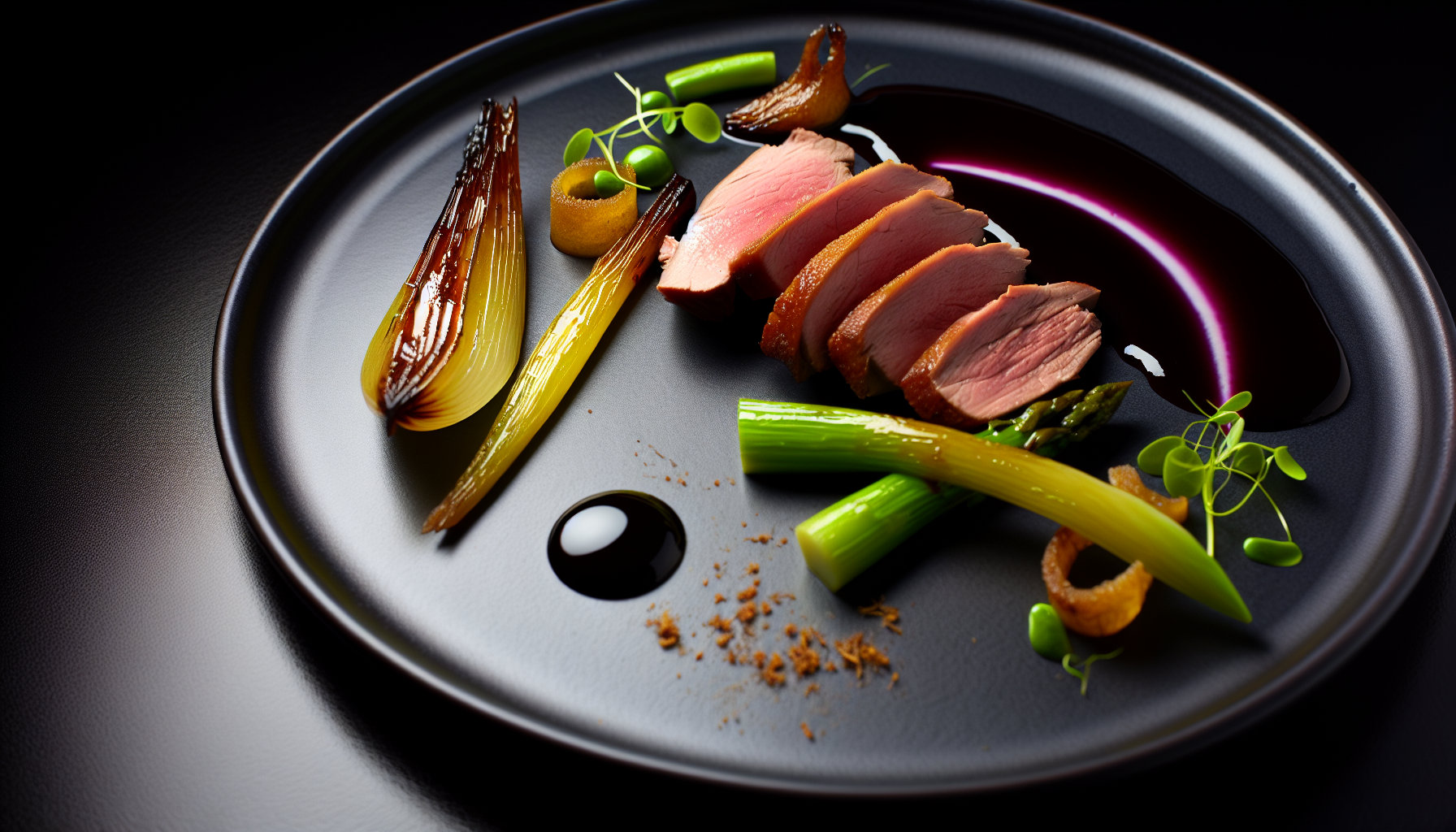 Lõpptulemus on elegantne ja kihiline: kontrastne mustsõstrapunane glasuur, krõbe pardinahk ja smaragdroheline spargel mustal taldrikul. Iga komponent on täpse tehnika tulemus – naha skoorimine, nappante-konsistentsini redutseerimine ja viimaks kastme monteerimine külma võiga. See on roog, mis sobib nii degustatsioonimenüü keskpunktiks kui ka signatuurtoiduks, pakkudes külalisele selgeid maitsejooni, kontrollitud intensiivsust ja meeldejäävat visuaali.