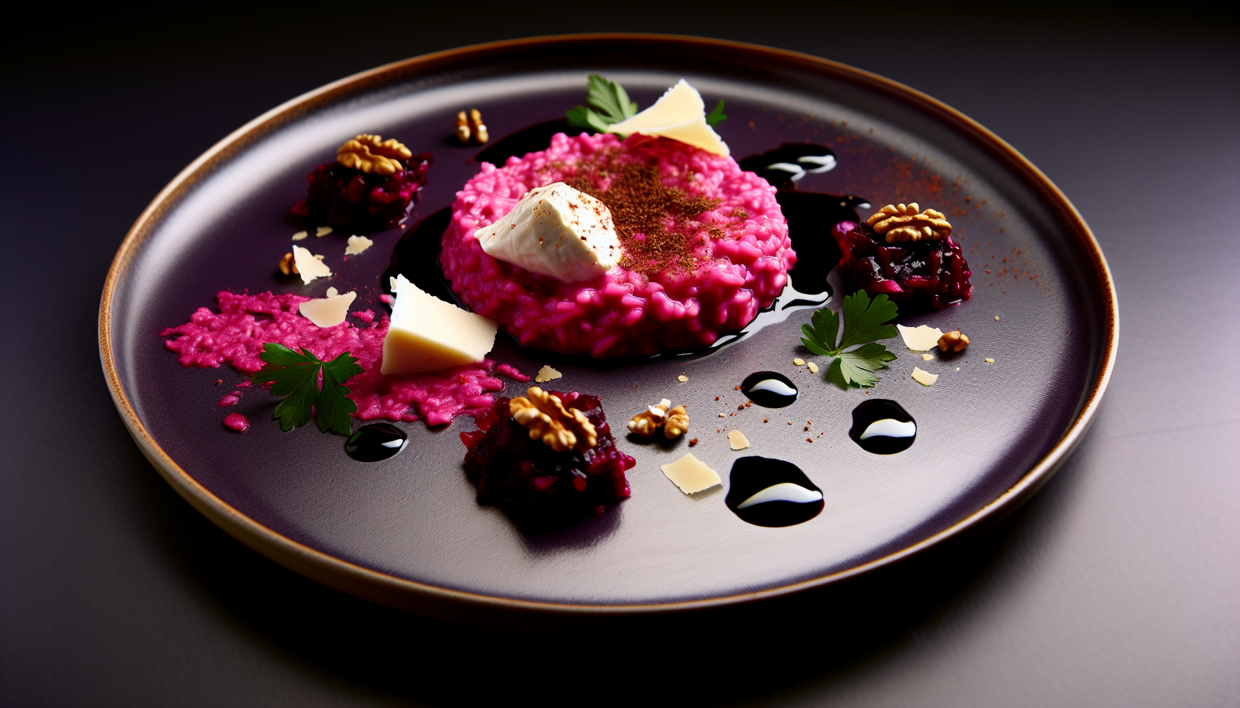 1) Fond: Lahusta köögiviljafond (25 g) ~900 ml kuumas vees ja hoia puljong vaiksel podinal. Soojenda eraldi peedimahl (100 ml). Rösti kreeka pähkel (40 g) kuival pannil 2–3 min, jahuta ja purusta. Riivi Parmigiano (60 g); jäta 15 g helvesteks. Haki shalottsibul (60 g) ja kuubista keedetud peet (250 g).
