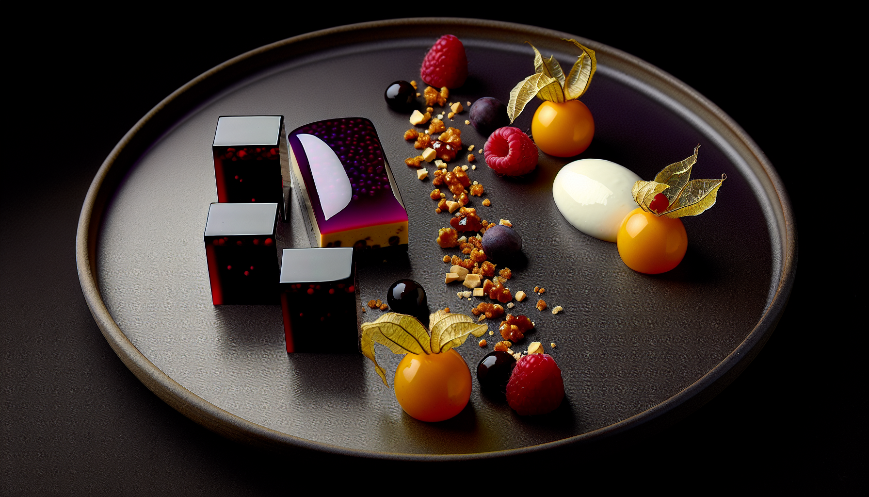 Tõstame Gruusia pelamushi tänasesse päeva: klassikaline viinamarja-maisi kreem saab uue hingamise passionivilja ja yuzu särtsuga, mille tasakaalustavad kreemjas vanilliga maitsestatud Kreeka jogurt ning röstitud pähklite elegantne krõmps. Magususe ja happesuse peen dünaamika töötab nii kodusel kui restoranilisel taldrikul – vormist ilmavalgust nägev läikiv, sügavlilla kreem on pilgupüüdja, mis ei vaja keerukaid abivahendeid. Röstitud kreeka- ja metspähklipuru lisab tekstuuri, vaarikad ja füüsal toovad värskust ning viigimarja-balsamico tõmbed seovad maitsed üheks tervikuks. Serveeri mustal taldrikul, et toonid tõesti helisema hakkaksid. Pelamushi 2.0 on lihtsasti teostatav, kuid tulemuseks on modernne, läbimõeldud desserdielamus.