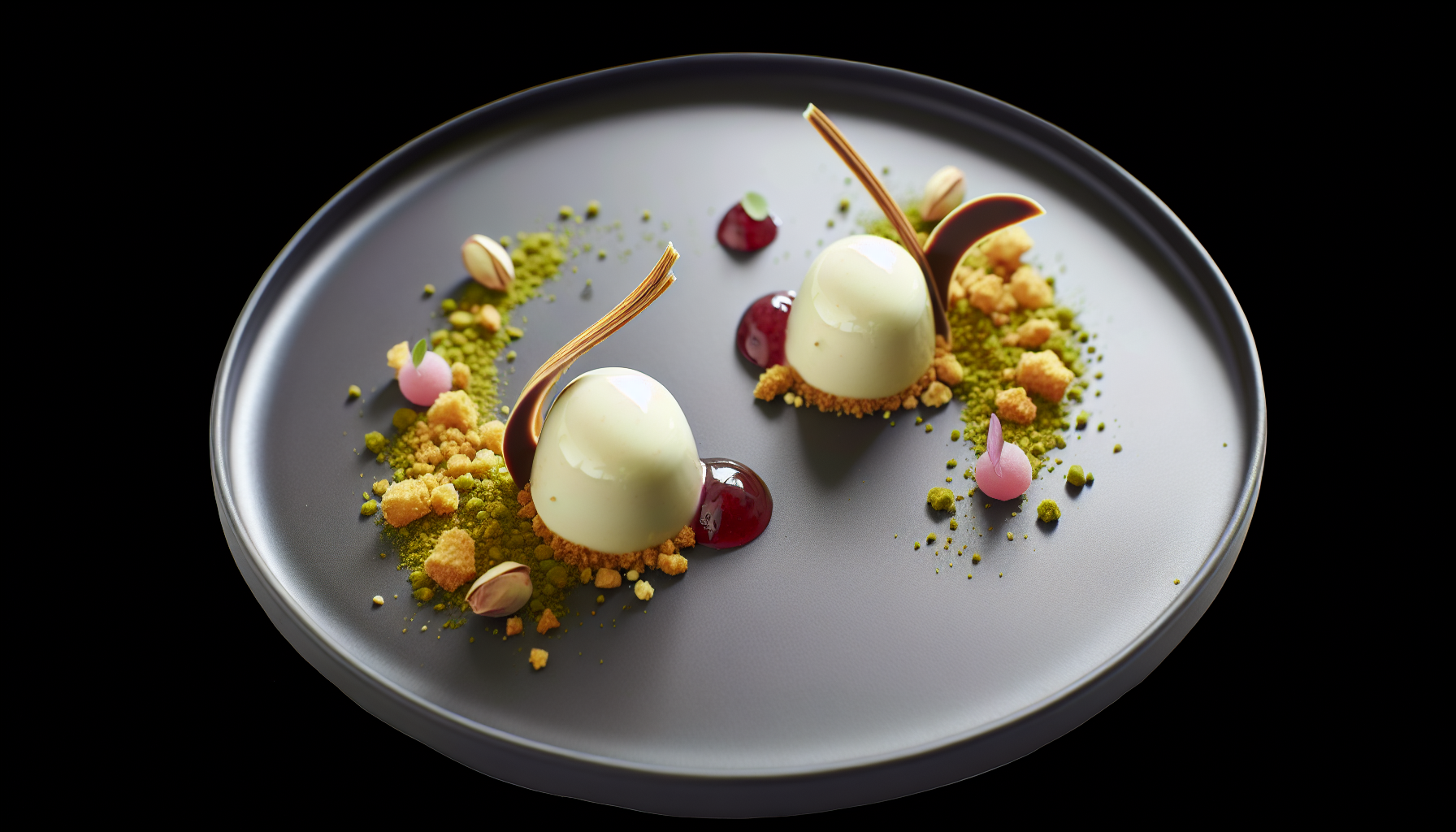 Digestive‑krõbe: Sega 120 g digestive‑puruga 30 g peeneks jahvatatud pistaatsiat (võta 30 g 60229-2 kogusest) ja 1 g meresoola (910132). Sulata 60 g võid (52100223), sega puru sisse ja jaota õhukese kihina küpsetuspaberile. Kuivata 160 °C pöördõhus 8–10 min, jahuta ja murra ebakorrapärasteks tükkideks. Želatiin: Paisuta 6 g želatiini (101230) 30 ml külmas vees (Vesi), lase 5 min seista. Valge šokolaadi baasmass: Sulata 120 g valget kuvertüüri (960557-55 5) veevannil (45–48 °C). Sega 250 g toorjuustu (90065 5) 10 g vanillisuhkru (960567- 2) ja 10 g suhkru (960250-0) ning 10 ml sidrunimahlaga (61011212666 6) ühtlaseks. Sulata paisutatud želatiin õrnalt (45–50 °C) ja sega juustumassi sisse, nirista juurde sulatatud šokolaad, sega ühtlaseks. Kreem: Vahusta 250 ml vahukoort (900298-1) pehmete tippudeni. Voldi 2–3 jaos juustusegusse. Lisa 30 g õrnalt hakitud pistaatsiat (60229- 2) tekstuuri jaoks. Tõsta mass kotti ja jahuta vähemalt 3 h kuni seatavaks. Rabarbriglaseer ja vaarikaelement: Kuumuta 60 ml rabarbrisiirupit (960289-2 4) 20 g suhkruga (960250-0) ja 5 ml sidrunimahlaga (61011212666 6) 1–2 min, jahuta – saad läikiva glasüüri. Püreeri 50 g vaarikaid (40621) 5 g suhkruga, suru läbi sõela coulis’ks; ülejäänud vaarikad jäta tervelt. Serveering: Tõmba mustale taldrikule vaarikacoulis’ joonekene, aseta kaks quenelle’i või ringiga vormitud kreemipärga, tilguta rabarbriglaseeri. Lisa digestive‑krõbe, hakitud pistaatsiat, värskeid vaarikaid ja 2–3 söödavat õit (40750-0). Hoia serveerimiseni külmas.