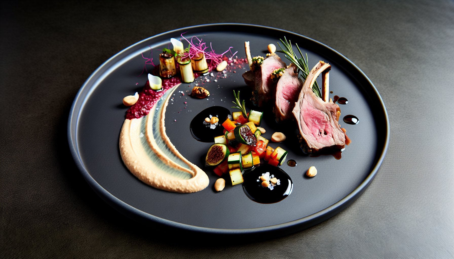 Peenetundeline taldrik, mis ühendab Vahemere ürdisuse Põhjala korrektsusega: mahlane rosmariini-küüslaugu lambakarree, siidine kikerhernehummus seedermänniseemnetega ning kiirelt sautée’tud ratatouille suvikõrvitsa, tomati ja punase paprikaga. Viigimarja palsamoglaze lisab täidlase magus-hapuka nüansi, mis raamib taldriku maitsekaart elegantselt. Hummuse kreemisus saavutatakse oliiviõli ja sidrunimahlaga, seedermänniseemned annavad pähklise sügavuse ilma tahinita – just paras, et kergendada rooga ja hoida fookus lambal.