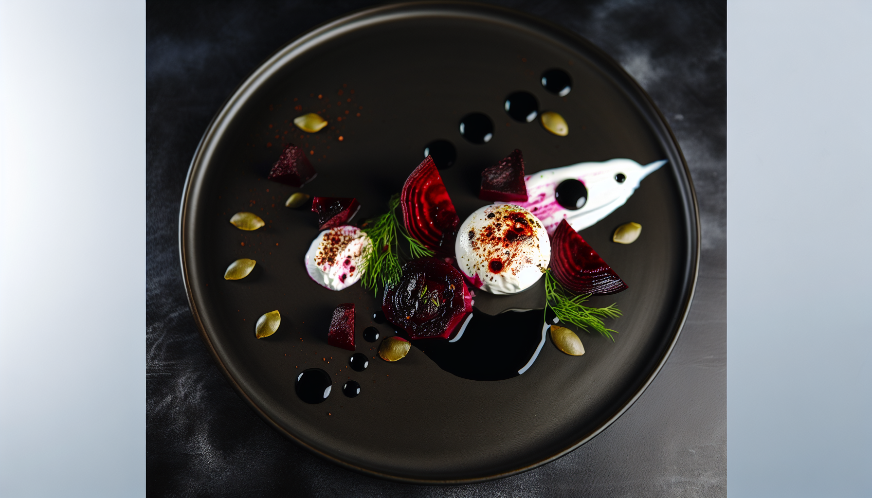 Röstitud peet, burrata ja mustsõstra-balsamico glasuur musta küüslaugu ning kõrvitsaseemnetega (AI koka retseptid)