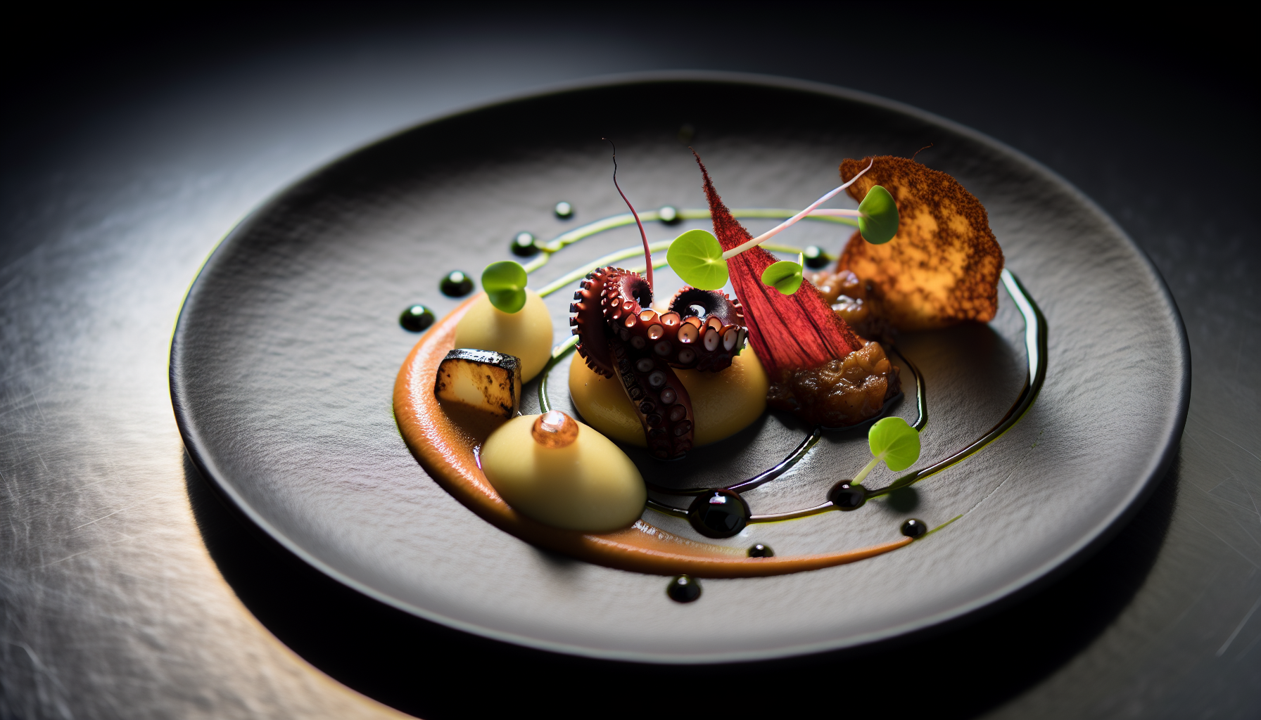 Söegrillil kõrvetatud kaheksajalg viigimarja-balsamico glasuuriga, suitsupaprika kartulipüree ja sidrunirohu-õliga (AI koka retseptid)