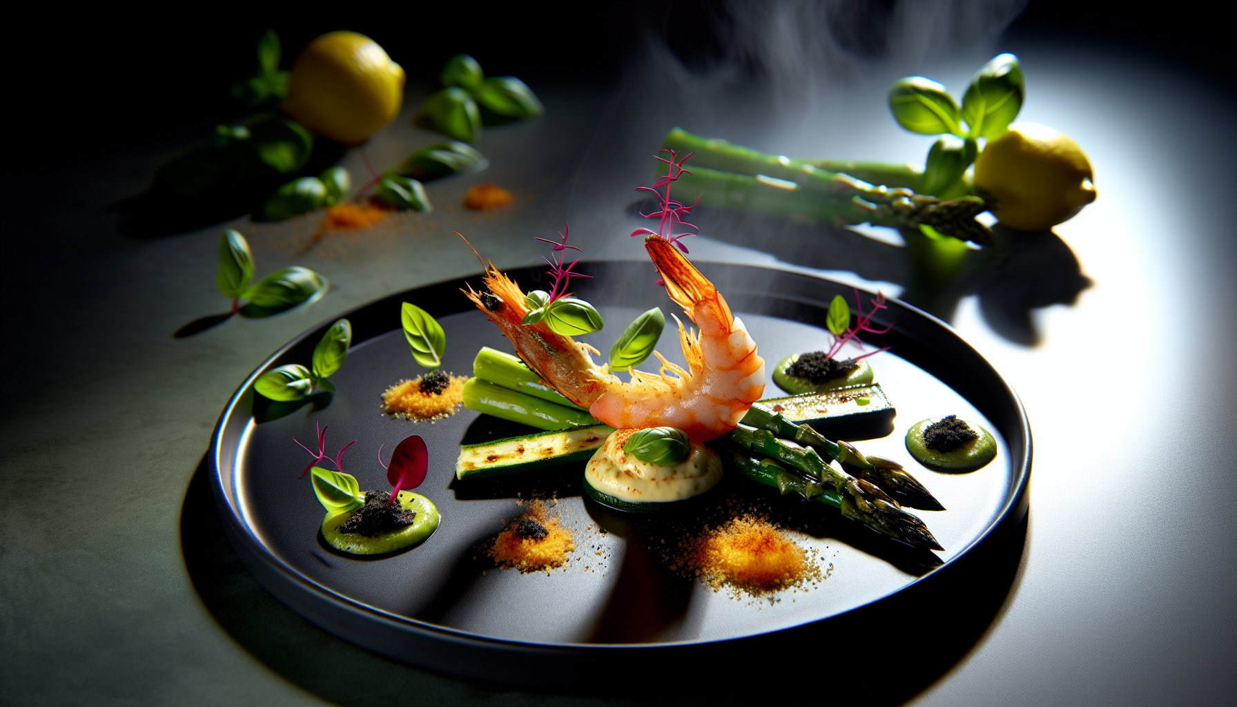 Söestatud spargli ja suvikõrvitsa ribadega krevetid sidruni‑anšoovise aiolis, musta küüslaugu krõbeda pudemega (AI koka retseptid)