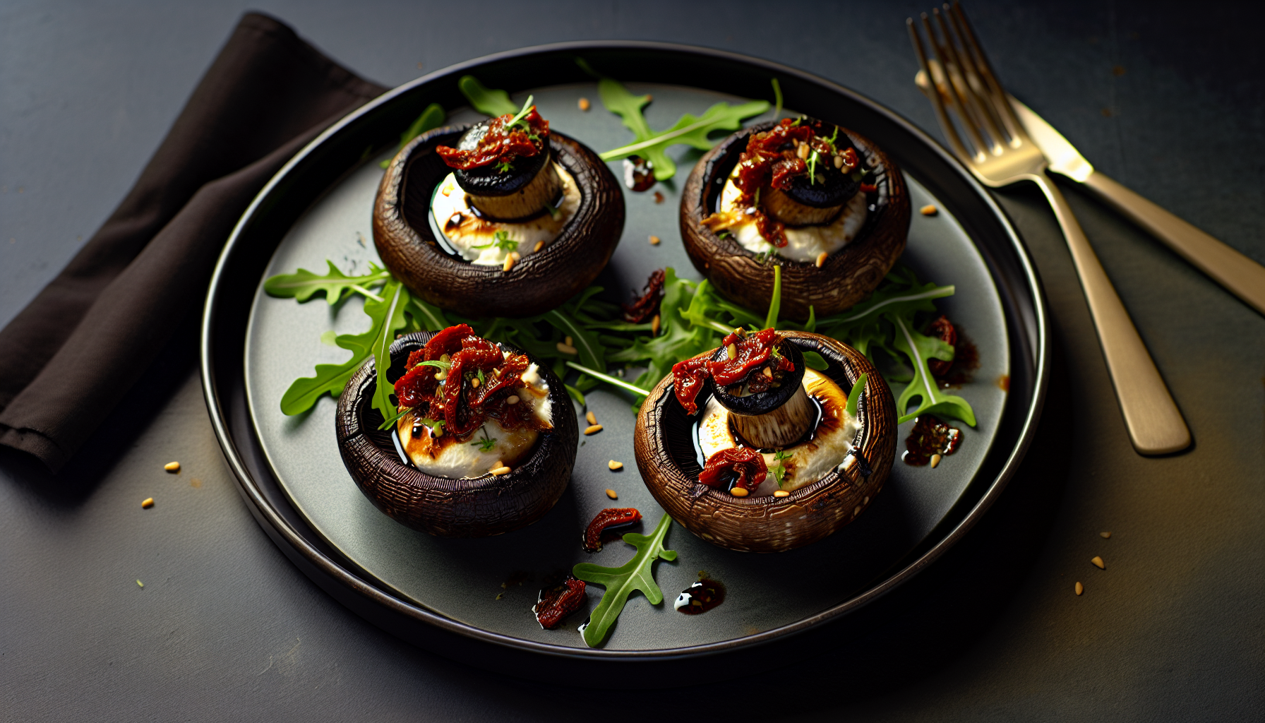 See on rafineeritud, kuid kodus jõukohane eelroog, mis ühendab portobello sügava umami, kreemise kitsejuustu ja viigimarja-balsamico sametise happemagusa nüansi. Päikesekuivatatud tomat lisab päikselist kontsentreeritud maitset, röstitud seedermänniseemned toovad krõmpsu ja pähklisuse ning rukola lisab piprast värskust. Tulemuseks on tasakaalus suutäis, mis näeb mustal taldrikul välja sama elegantne, kui maitseb – ideaalne nii õhtusöögi avanguks kui jagamiseks sõpradega.