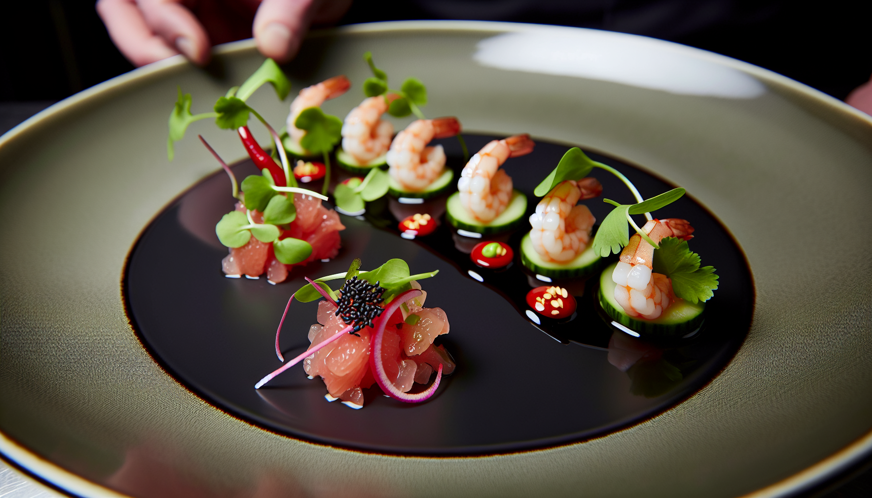 Yuzu-ponzu ceviche vannamei krevettidega, punase greibi ja musta seesamiseemnega (AI koka retseptid)
