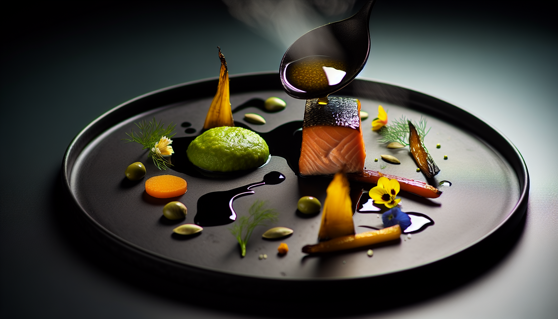 Lõhe küpseb esmalt pannil naha krõbedaks ja lõpetab ahjus, et süda jääks mahlane ja klaasjalt habras. Kogu plaat on komponeeritud mustale taldrikule, kus värvide kontrast – roheline, kuldkollane ja lõhe korall – loovad minimalistliku, ent meeldejääva kompositsiooni. Garnituuriks on õrnad söödavad õied, mis ei ole vaid kaunistus, vaid õrnade taimsete nootide kandja. See on modernne taldrik, mis austab tooraine puhtust ja tekstuuri ning räägib korraga kahes keeles: põhjamaine ja umami.