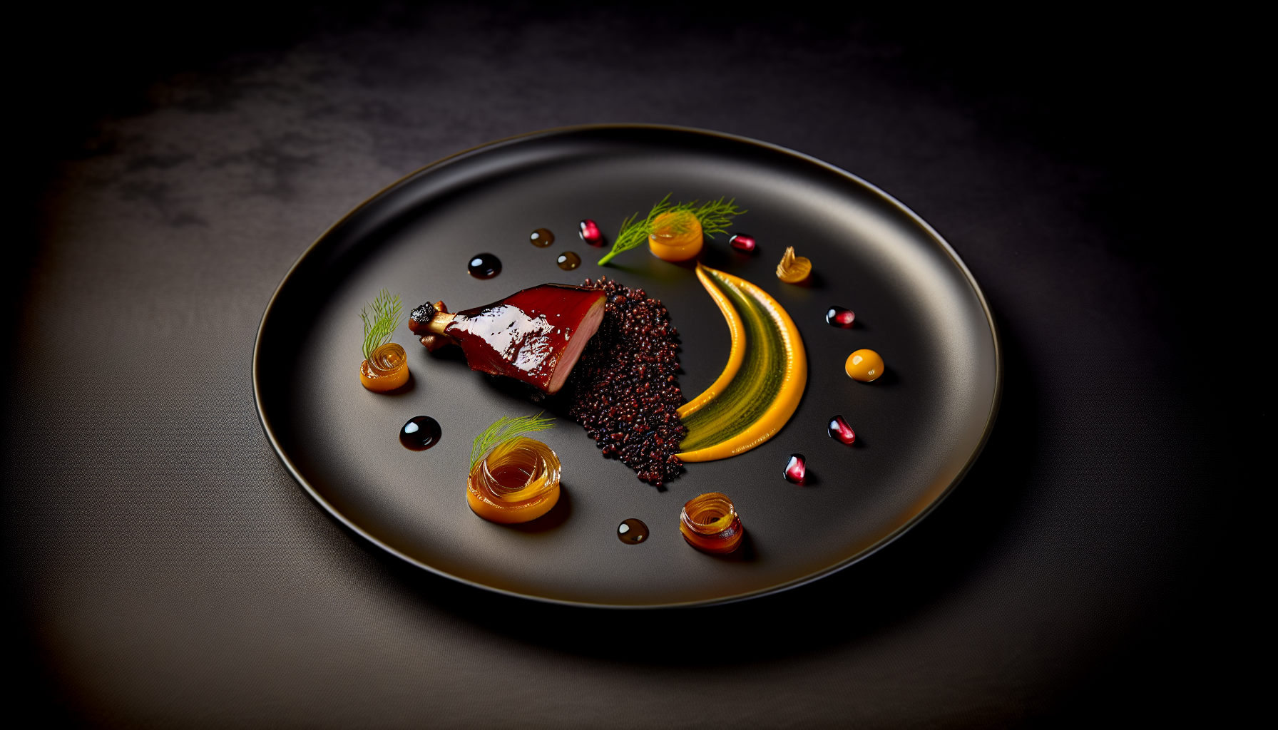 7) Serveeri: Tõmba taldrikule kõrvitsapüree kaar. Aseta kõrvale kinoa quenelle. Säti peale läikiv pardikoib. Tilguta tilliõli, lisa marineeritud šalotirõngad ja granaatõunaseemned. Viimistle meresoola kristallide ja värske pipraga.